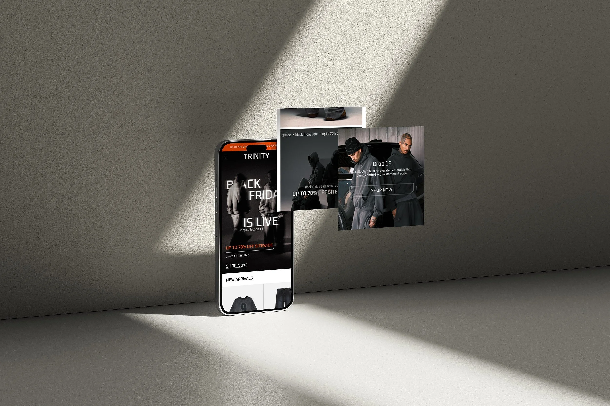 Adopted an edgy minimalist design approach, aligning with Trinity's clean aesthetic and brand guidelines. Delivered a sleek and luxe website homepage, and engaging Meta ad creatives that highlight the brand’s timeless high-end essence. Every element was designed to excite and resonate with Trinity’s loyal audience.